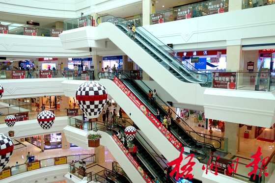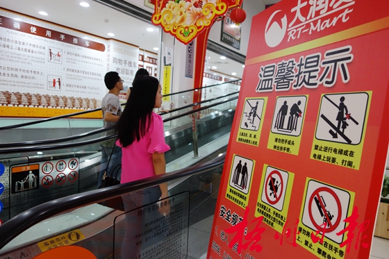 我市各大商場在電梯口位置放置提示,提醒乘客規范乘坐電梯。