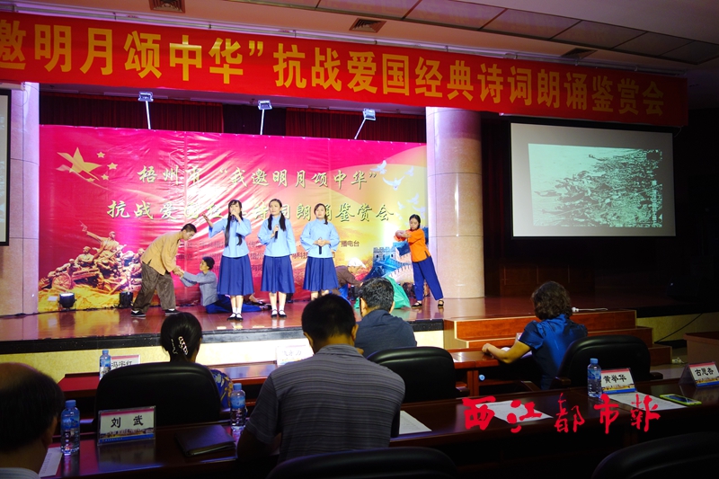 ????“我邀明月頌中華”抗戰愛國經典詩詞朗誦鑒賞會上的第一首詩詞作品,便奠定了鑒賞會莊嚴、肅穆的基調。昨日下午,由中共梧州市委宣傳部主辦、梧州市人民廣播電臺承辦的“我邀明月頌中華”抗戰愛國經典詩詞朗誦鑒賞會在市國稅局舉行。