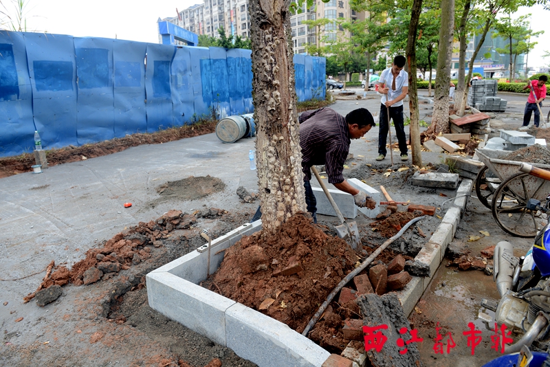 ??? 9月1日,施工人員在三龍大道龍魚塑像附近的人行道改造樹池綠化帶。