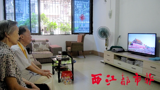 ?倪錫剛(左二)和肖雪芬正在收看閱兵儀式。