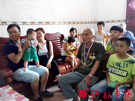 ??? 昨天上午,當(dāng)記者來(lái)到長(zhǎng)洲區(qū)倒水鎮(zhèn)倒水村梧州抗戰(zhàn)老兵劉貴培的家中時(shí),劉貴培一家四代共計(jì)二十人,已經(jīng)早早守在了電視機(jī)前,一家人有說(shuō)有笑,正在觀看中國(guó)人民抗日戰(zhàn)爭(zhēng)暨世界反法西斯戰(zhàn)爭(zhēng)勝利70周年紀(jì)念大會(huì)。