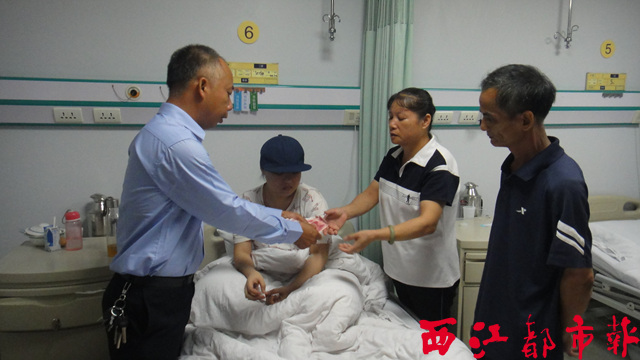 9月1日,張敬壯(左)來到梧州市紅十字會醫院探望患病女孩張文靜,并鼓勵她積極治病。黃超亮/攝