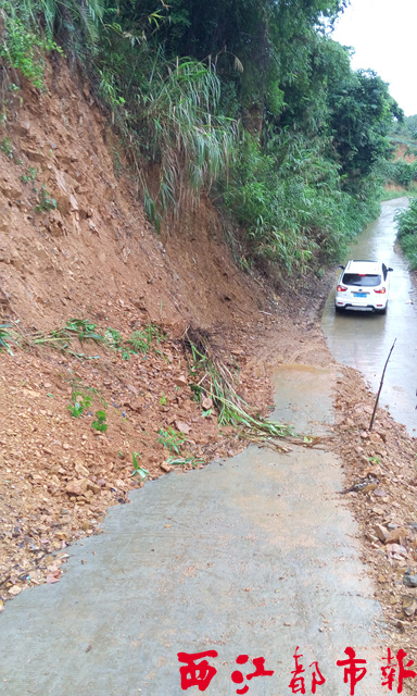 ????9月7日,受暴雨天氣影響,通往蒼梧縣京南鎮太平村村委的道路上發生輕微山體塌方情況,幸無人員傷亡。 龍天傳/攝