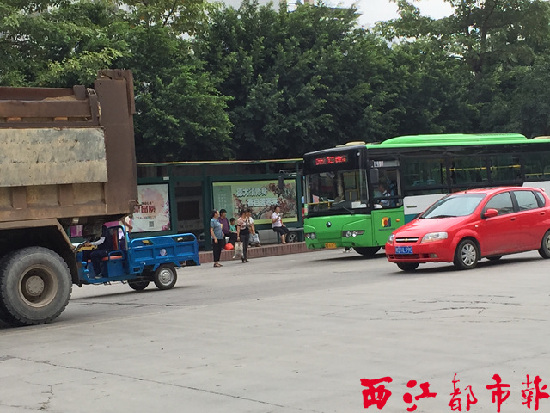 9月8日,在七中公交車站前,有市民在一輛公交車前走過,欲橫穿馬路。楊珊/攝