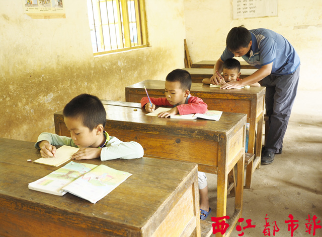 ??? 近日,馮柱強(qiáng)老師在給學(xué)生上課。馮柱強(qiáng)是梧州市旺甫鎮(zhèn)中心校思猛分校的老師,也是這個學(xué)校唯一一名老師。他已在思猛分校工作了16年,目前該校連學(xué)前班學(xué)生在內(nèi),僅有學(xué)生8人。馮柱強(qiáng)一直堅(jiān)守在這里,只為了村里的孩子上學(xué)不用跑那么遠(yuǎn)的路。他說:“為了孩子們,哪怕只剩一個學(xué)生,我也會教下去。” 西江都市報(bào)記者 陳健新攝