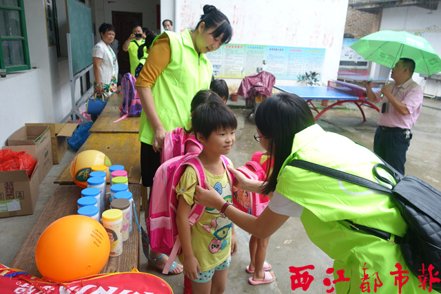9月7日,梧州愛心助學群的網友為京南鎮太平村中心小學的新生送上嶄新的書包。