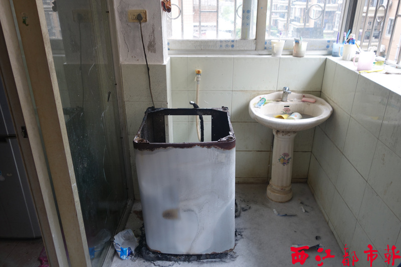 進入起火的房屋內,只見大廳和陽臺地面正流淌著大量的洗滌液體,仔細一看,原來這些水大部分是從陽臺的一臺洗衣機內流出的,而這臺洗衣機已經被大火燒得只剩下一個外殼。