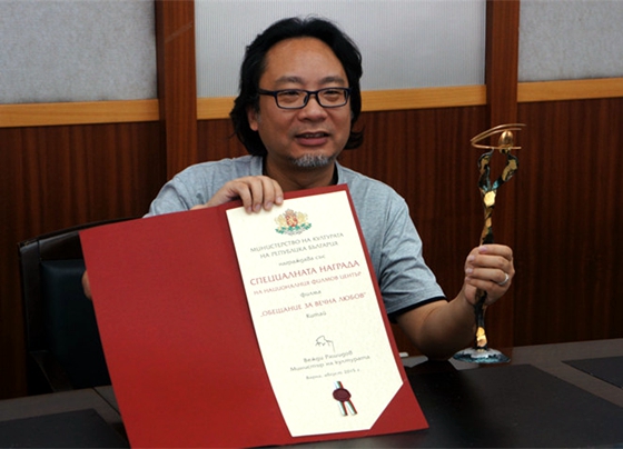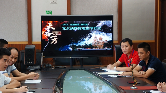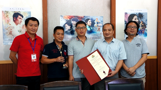 廣東廣視傳媒有限公司導演、電影《天各一方》導演云山向媒體朋友展示早前在2015年保加利亞第23屆瓦爾納國際電影節(jié)上榮獲的最佳影片獎的獎狀和獎杯