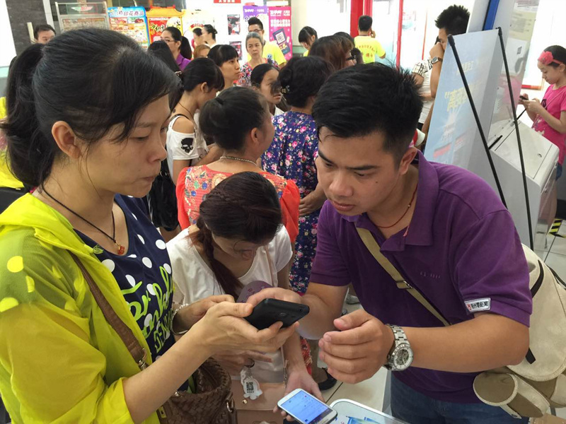 9月19日上午在旺城廣場活動(dòng)現(xiàn)場,工作人員向市民介紹零距離新聞客戶端在安裝方法。