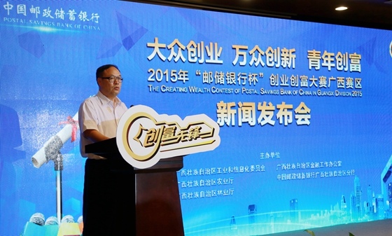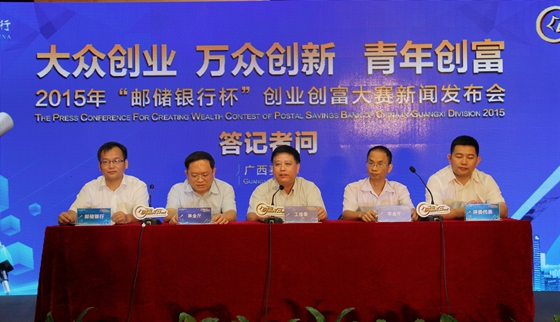 ??? 大眾創業,萬眾創新,青年創富。9月15日,2015年“郵儲銀行杯”創業創富大賽(廣西賽區)新聞發布會在首府南寧舉行。自治區工信委、自治區農業廳、自治區林業廳、自治區金融辦、郵儲銀行廣西區分行等5家主辦單位領導、代表及區內各大主流媒體出席了發布會。發布會上,大賽組委會發布了今年的賽程賽制,并舉辦了媒體問答會,對今年大賽的新政和亮點進行了解讀。
