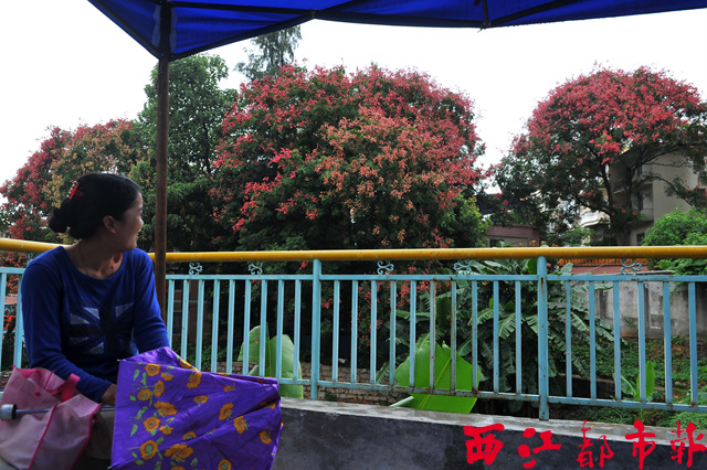 ????9月21日,根據附近一名市民的指引,記者來到梧州市長洲區石人沖君安頤養院附近路段。在該頤養院門口的道路一旁,五六棵高度為十米左右的行道樹排成一排,樹上均是紅彤彤的一片鮮花,甚為壯觀,不少過往路人紛紛駐足欣賞。