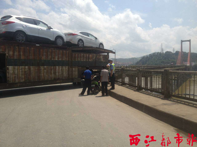 ????據了解,當天中午11時30分,梧州市公安局交警支隊萬秀大隊接到報警,稱云龍大橋北橋頭被一輛貨車“堵”住了。隨后,萬秀大隊的民警趕到現場,看到一輛30多米長、滿載全新小型客車的半掛貨車,正橫向停在云龍大橋北橋頭與轉盤之間,進退兩難。由于車身過長,該半掛貨車的右前輪甚至還撞壞了路邊的人行道。