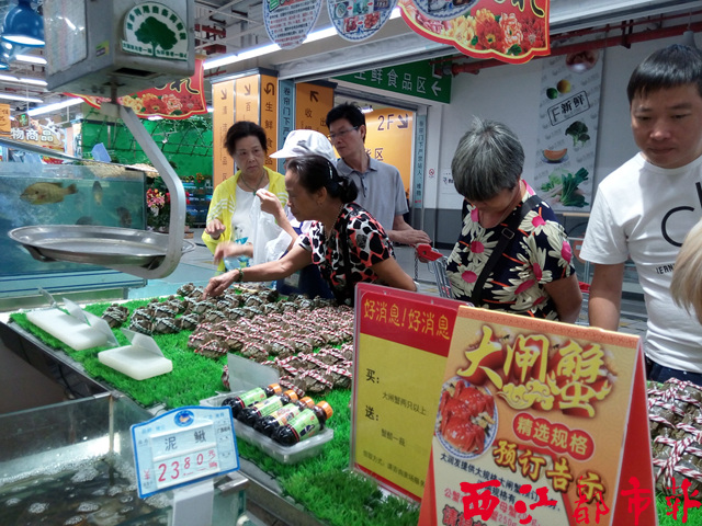 ????據大潤發超市大閘蟹銷售專區的銷售人員黎小姐介紹,部分大閘蟹正在進行打折促銷活動,原價為每只18.8元的大閘蟹折后價只需9.8元?!斑@款大閘蟹由于價格比較便宜,一個上午就已經銷售一空,目前正在補貨。”她說,大閘蟹不僅年輕人愛吃,近期前來購買大閘蟹的,很多都是上了年紀的街坊。黎小姐認為:“到了中秋節假期,銷量可能會更好。”