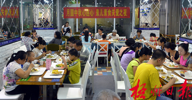 ????9月24日晚,由梧州日報社黨委、大塘街道辦黨工委、素兒素食店主辦,梧州日報社團委愛心聯盟協辦的“月圓中秋心連心 素兒素食關愛之夜”活動繼續傳遞關愛。來自金葉社區、豐業社區、龍山社區等10個社區的貧困家庭、孤寡老人、留守兒童在社區黨員志愿者、“雙報到”單位黨員志愿者的陪伴下,共進晚餐,提前歡聚中秋。