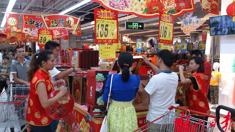 中秋佳節臨近,一些商家在節前對月餅等應節食品實行打折促銷,吸引不少顧客前來選購。