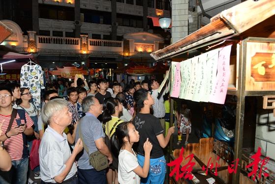 9月27日晚,在騎樓城景區,市民正參加猜燈謎活動。 雖然當晚出現多云天氣,明月久未“現身”,但市民慶賀中秋的喜悅心情不減,不少人晚飯后出門散步,到商業街、商場、公園游玩。 李鴻榮 攝