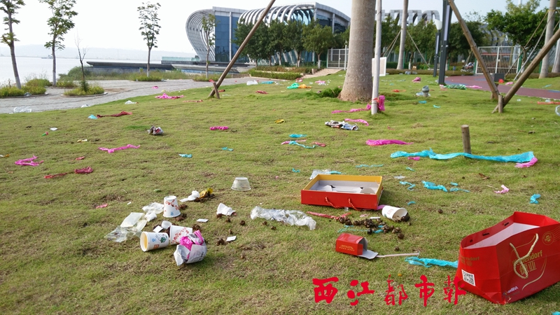 ????西江都市報訊(記者 蒙敏瑩 文并攝)中秋之夜,不少市民攜家帶口來到公園內游園賞月。然而,由于部分市民存在違規燃放孔明燈、隨意丟棄垃圾等不文明行為,干凈整潔的公園變得垃圾遍地,環境受到破壞。