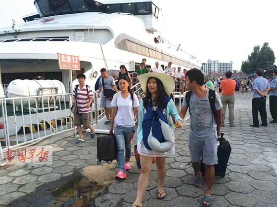 受臺風“彩虹”影響,北海至潿洲島航線將于10月4-7日全線停航。10月3日,北海安排20趟客船前往潿洲島緊急撤離游客,截至當晚8時許,約1.1萬人次順利返回北海市區。圖為游客在北海下船。記者 彭慶攝