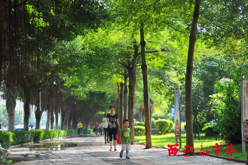 ??? 10月7日,在梧州市西堤路,陽光穿過枝葉飄灑在林蔭道上。 隨著臺風“彩虹”對梧州的影響在6日晚基本消除,晴好天氣在昨日回歸。 西江都市報記者 何鎏/攝