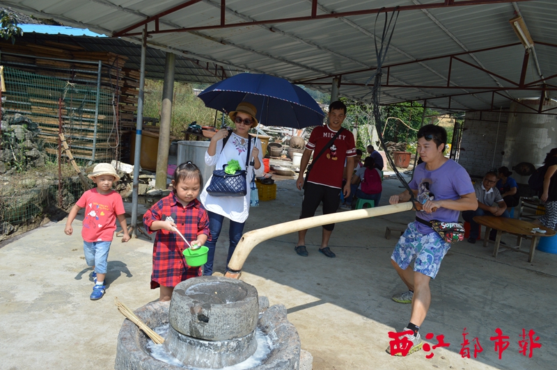 ??? 國慶長假期間,幾位柳州游客帶著孩子在蒙山縣新圩鎮(zhèn)古定村鄉(xiāng)村游景點磨豆?jié){,體驗鄉(xiāng)村農(nóng)家樂。