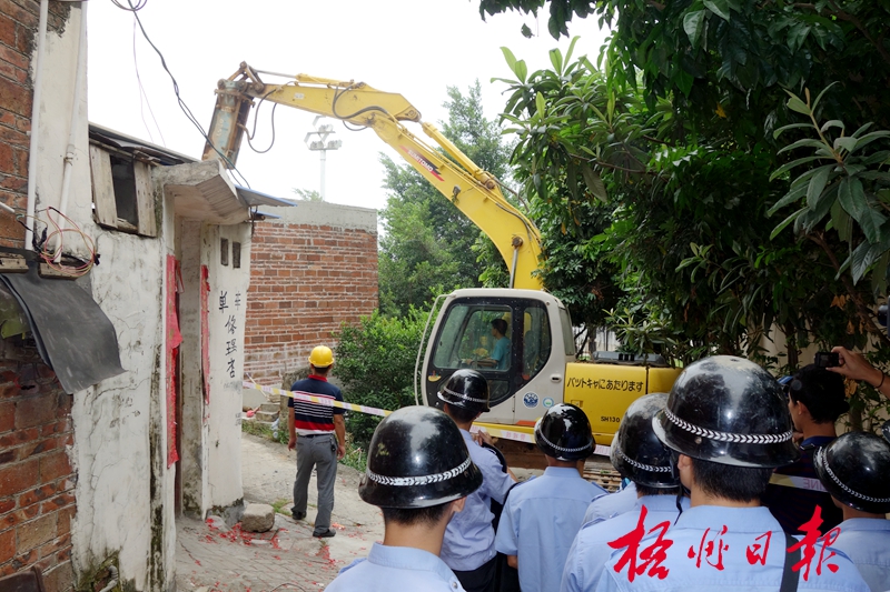 ????在長洲區菊湖路,共有6間建筑面積約為1200平方米的磚混結構房屋和鐵棚屋,因未取得建設工程規劃許可證、土地使用證和選址意見書,未經國土、住建等部門許可而擅自建設,被認定為違章建筑物。今年7月份,長洲區對這些違章建筑物作出了限期拆除決定書,但違章建筑所有權人無視有關規定和要求,因此有關部門組成聯合執法隊,依法強制拆除。當天,粵桂合作特別試驗區范圍內的塘源村大戶二組3戶占地面積為320平方米的違法搶建“兩違”建筑,也因為在限期內未自行拆除,被有關部門依法強制拆除。