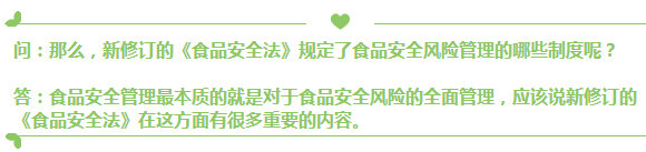 ????2009年的《食品安全法》就體現了食品安全風險治理的理念,但是風險治理理念貫徹的不徹底。新的《食品安全法》亮點頗多,最重要的是,它確立了食品安全工作的新理念,把風險治理的理念貫徹到食品生產經營的全過程,即規定了食品安全工作要實行預防為主、風險管理、全程控制、社會共治的基本原則,建立科學、嚴格的監管制度。所以這次修法完善了過去的風險監測和評估制度,增加了分級制度、交流制度、自查制度、約談制度。