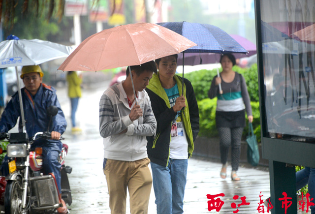 ??? 10月10日,在梧州市新興二路,市民冒雨出行。當天,受強冷空氣的影響,梧州市迎來降溫降雨天氣。此次降溫幅度較大,不少市民也適時地增添了衣物。 西江都市報記者 蒙紹松/攝