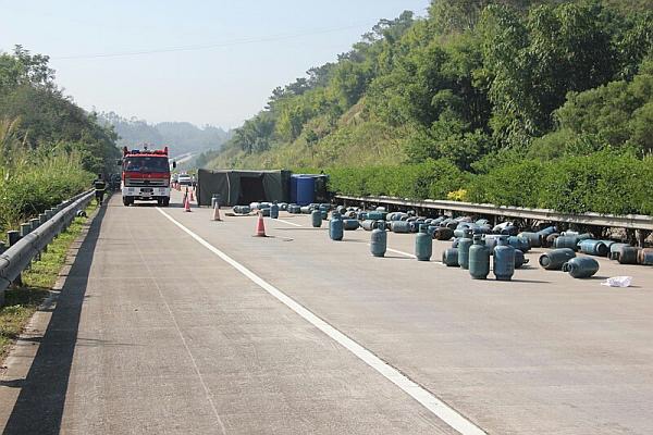 截至當日12時30分,事故車輛被拖離高速路面,散落的液化氣瓶被安全轉運,高速公路恢復正常通行。目前,事故原因正在調查中。(交宣) |