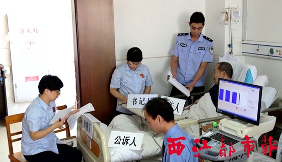 ??? 西江都市報訊 近日,梧州市中醫醫院某病房內出現了一些特殊的訪客,他們是長洲區法院的法官、書記員和法警,以及長洲區檢察院的檢察官。他們在病房內設立了臨時特別法庭,開庭審理一起盜竊案。