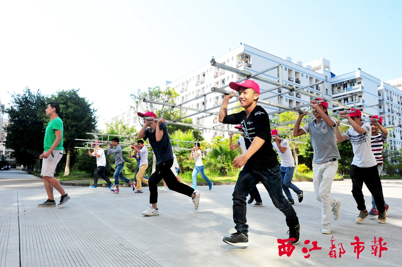 10月16日下午,烈日當空,梧州職業學院數百名學生在導演和工作人員的指揮下,在操場上按照節目編排的要求快速找到自己的站位,排好隊形。