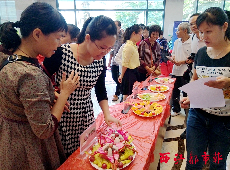 現(xiàn)場(chǎng)滿足居民的微心愿后,居民文藝隊(duì)和幼兒園的小朋友還奉上了精彩的慰問(wèn)演出。隨后,當(dāng)天活動(dòng)最引人關(guān)注的“拼水果”大賽開(kāi)始了。來(lái)自長(zhǎng)洲區(qū)檢察院、粵成房地產(chǎn)開(kāi)發(fā)公司、長(zhǎng)洲區(qū)團(tuán)委等9個(gè)雙報(bào)到單位的選手們紛紛以慶重陽(yáng)拼中國(guó)夢(mèng)等為主題,充分發(fā)揮專業(yè)特長(zhǎng),與居民們一起現(xiàn)場(chǎng)精心制作水果拼盤。這些水果拼盤由西瓜、芒果、火龍果、楊桃、圣女果等現(xiàn)場(chǎng)切割、拼接而成,設(shè)計(jì)頗為美觀,讓居民們嘖嘖稱奇。