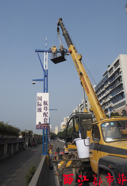 ????近日,施工人員在鴛江大橋進行路燈桿噴漆翻新。為迎接廣西第十三屆運動會在梧州市舉行,負責市區路燈亮化整治項目的施工單位,正加緊對市區部分主干道的路燈進行檢查維修,以及對燈桿噴漆翻新。 西江都市報記者 陳健新/攝