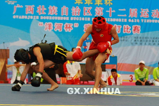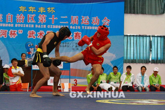 區(qū)運(yùn)會武術(shù)散項(xiàng)目比賽中男子甲組58公斤級南寧市凌文盛(紅方)對陣桂林市黃朝榮(黑方)的比賽。劉世旭 攝