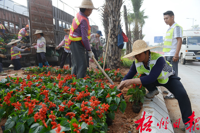 ????10月27日,在毅德城附近道路,工人正在綠化帶上種植鮮花植物。