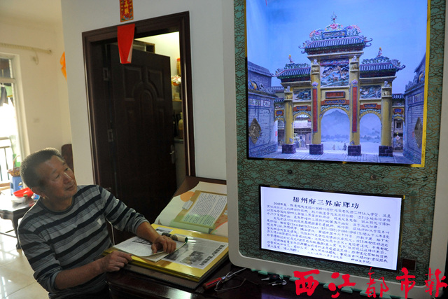 ????10月23日,記者來到葉權生的家中,一進門就見其客廳柜上放著一個大玻璃罩,里面是剛完工不久的梧州“三界廟牌坊”模型。立體模型中的牌坊高55厘米,放置在約1.3米高,縱深0.5米的模型箱中,燈光一映照便散發古樸的幽幽藍光。