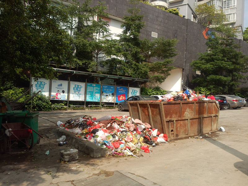 10月28日,記者到位于新興二路大正商業(yè)廣場附近的興安小區(qū)走訪,發(fā)現(xiàn)報(bào)料市民所指的露天垃圾池就設(shè)立在通往小區(qū)的大道旁,周邊住宅樓林立,每天都有許多行人和車輛在該大道通行。雖然已經(jīng)是上午十點(diǎn)多,但這個(gè)露天垃圾池已經(jīng)滿溢,散落在地的垃圾也堆成了一座“小山”,發(fā)出陣陣臭味。住在附近私人住宅的市民梁女士表示,自己是一名孕婦,每天都會(huì)出門買菜或者散步,每次經(jīng)過這里都覺得非常惡心,而且這些垃圾堆在路旁,十分影響市容市貌。