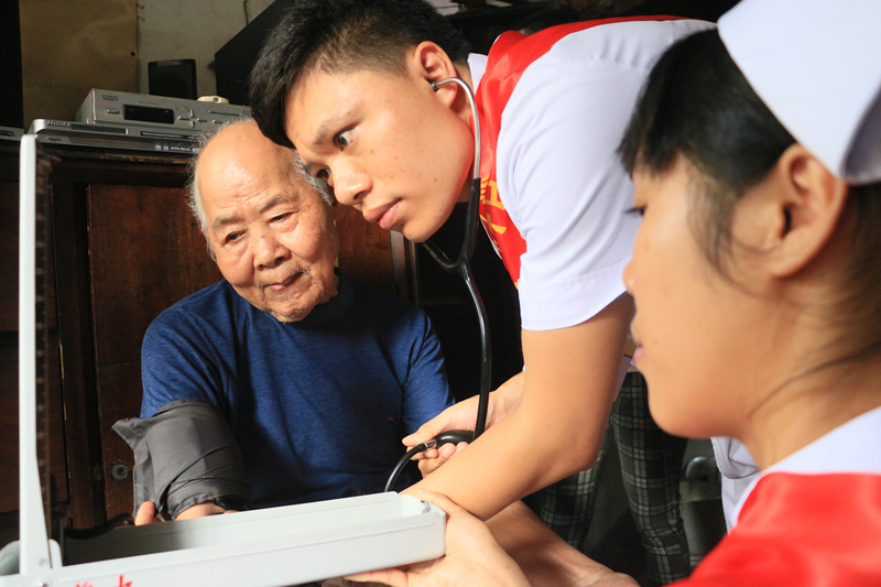 圖為來自醫療系統的青年志愿者老人測量血壓。