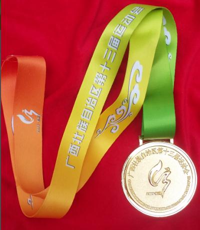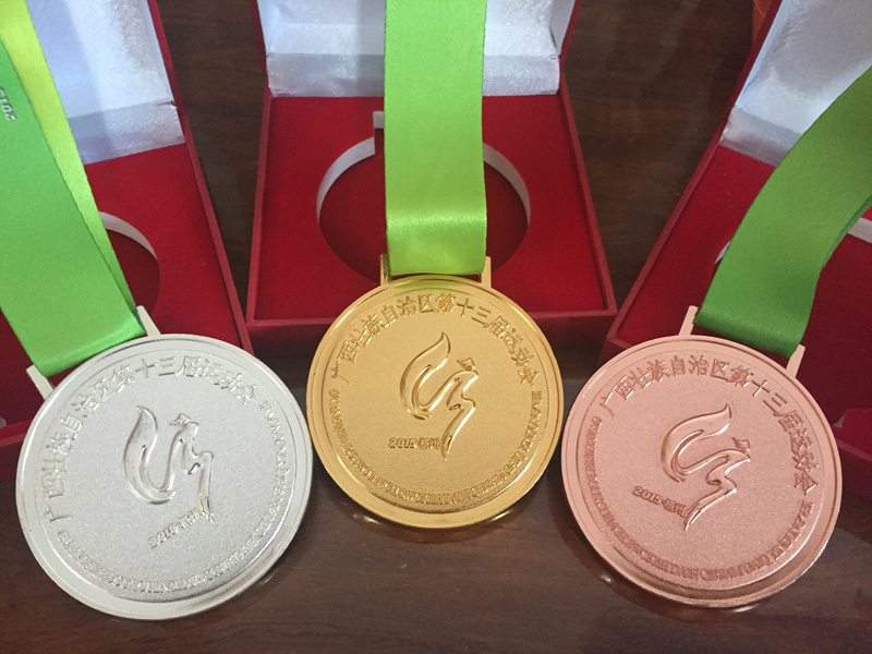 本屆區(qū)運(yùn)會(huì)獎(jiǎng)牌分金牌、銀牌、銅牌,主體材質(zhì)為紫銅,金牌外層鍍金、銀牌外層鍍銀、銅牌外層鍍銅。獎(jiǎng)牌設(shè)計(jì)規(guī)格為直徑65毫米、外沿厚度為5毫米,正面為第十三屆區(qū)運(yùn)會(huì)會(huì)徽“精彩區(qū)運(yùn) 舞動(dòng)綠城”圖案,并刻有“廣西第壯族自治區(qū)第十三屆運(yùn)動(dòng)會(huì)”漢字字樣及壯文拼音字母;獎(jiǎng)牌背面為第十三屆區(qū)運(yùn)會(huì)吉祥物“龍龍”、“和和”圖案,刻有“2015.11 梧州”字樣。