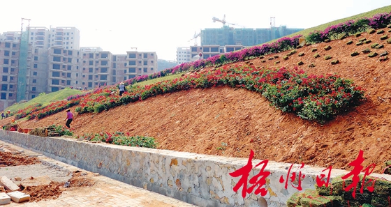?10月28日,紅嶺體育場旁、市綜合館對面的土坡,施工人員在鋪草皮、種寶巾花。該處計劃鋪草皮約4000平方米,在高處種100多株球型紫色寶巾花,正中位置種1200多株大紅寶巾并形成波浪造型,整體提升土坡綠化景觀效果。梁萍 攝