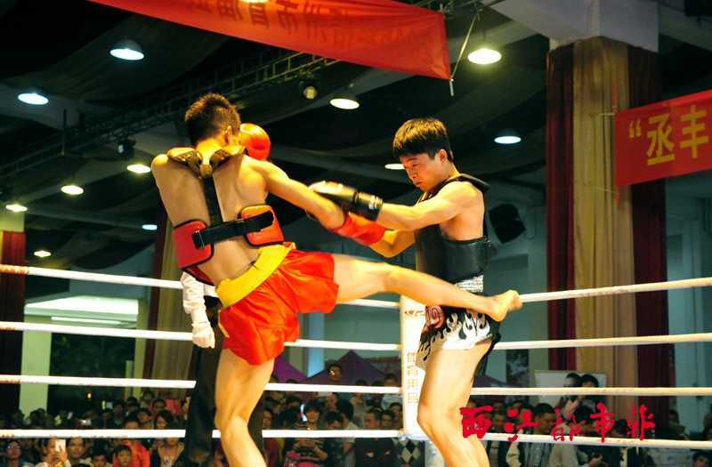 ??? 10月31日晚,在2015年梧州市首屆武狀元搏擊擂臺賽53公斤級的決賽中,市丞豐建材代表隊的趙鍇誠(紅方)以2∶0的比分擊敗對手,獲得了53公斤級金牌。當晚,梧州市首屆武狀元搏擊擂臺賽舉行總決賽,五個級別分別決出了冠軍選手。