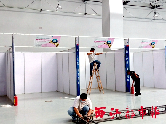 施工人員在珠寶展區(qū)搭建展位。 西江都市報(bào)記者 朱元冬/攝
