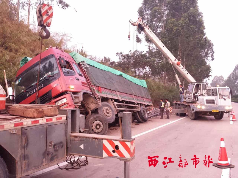 ??? 西江都市報訊 11月2日凌晨4時40分,一輛重型貨車側(cè)翻在G80廣昆高速梧州段,事故造成車輛損壞嚴(yán)重,所幸無造成人員傷亡。