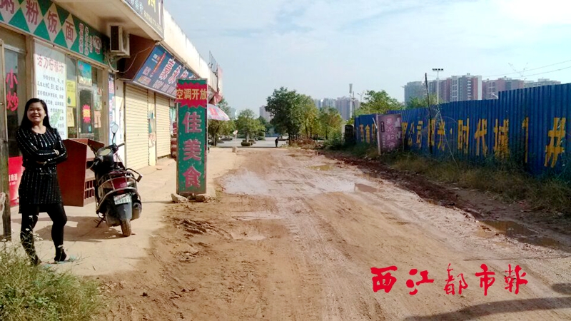????11月2日,記者來(lái)到火車站旁的好味閣餐館前發(fā)現(xiàn),由火車站方向通往在建的梧州公租房施工地的兩三百米的道路路面并不平整,路面上鋪了厚厚一層泥,最厚的泥土層估計(jì)有五六厘米,只有部分路段勉強(qiáng)可以看到水泥路面。