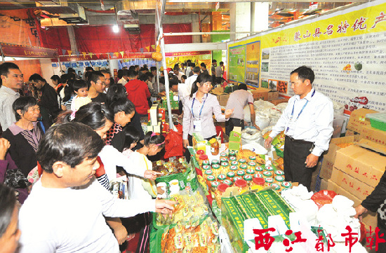 在梧州名特優(yōu)產(chǎn)品展銷會(huì)上,人們正在選購?fù)撂禺a(chǎn)。李鴻榮/攝 (資料圖)