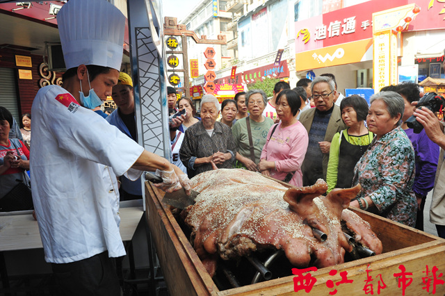 ????位于五坊路和大南路交叉路口的一個美食節攤點前,擠滿了人,不少人舉著手機和相機在拍照和錄像。走進一看,原來是《舌尖上的中國》節目中赫赫有名的順德均安蒸豬,也登上了嶺南美食街的列車。