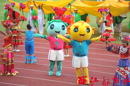 本屆區(qū)運(yùn)會(huì)的吉祥物“龍龍”、“和和”出場參與表演。記者?何鎏/攝