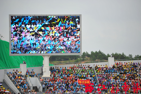 現(xiàn)場直播畫面出現(xiàn)在中恒體育場左右兩側(cè)的大型電子顯示屏上,令上鏡的觀眾興奮不已。