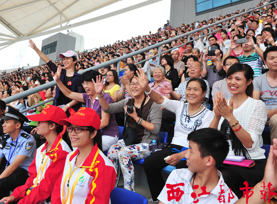 ????來自蒼梧縣京南鎮(zhèn)的60歲老人李忠建,當(dāng)天早早地從鎮(zhèn)里趕來等候開幕式的開始。觀看節(jié)目的時(shí)候,他數(shù)次情不自禁地?zé)崃夜恼啤K嬖V記者,整場開幕式表演,從演員到服裝到音樂,都充滿歡快感,他特別喜歡。“例如,最后表演的節(jié)目《梧州追夢》,演員們穿著五彩繽紛的服裝在操場上邊唱邊跳,讓人感覺特有活力。”李忠建笑著說。