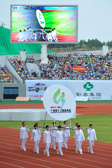 十名男青年肩扛本屆區(qū)運(yùn)會會徽走過主席臺。 西江都市報(bào)記者 何鎏/攝