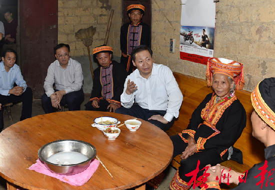 ????調研期間,彭清華主持召開座談會,聽取梧州市和蒙山縣、岑溪市、藤縣主要負責人匯報精準識別工作情況。有關鄉鎮黨委書記、扶貧工作隊隊長、駐村第一書記代表等參加座談并踴躍發言,他們介紹了進村入戶開展精準識別工作情況和體會,提出工作中遇到的問題和改進建議。彭清華認真傾聽,與大家共同分析原因、探討解決辦法。